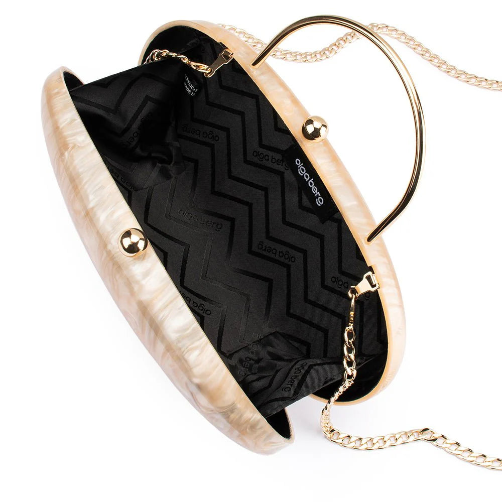 The IMELDA Acrylic Top Handle bag showcases pearlescent curved lines in a sleek pod-style design. This compact clutch features a slim top handle for effortless carrying, magnetic closure for security, and a removable shoulder chain. Crafted from pearlised acrylic with gold-tone hardware, it holds a large smartphone and includes a protective dust bag. Designed in Melbourne, Australia.