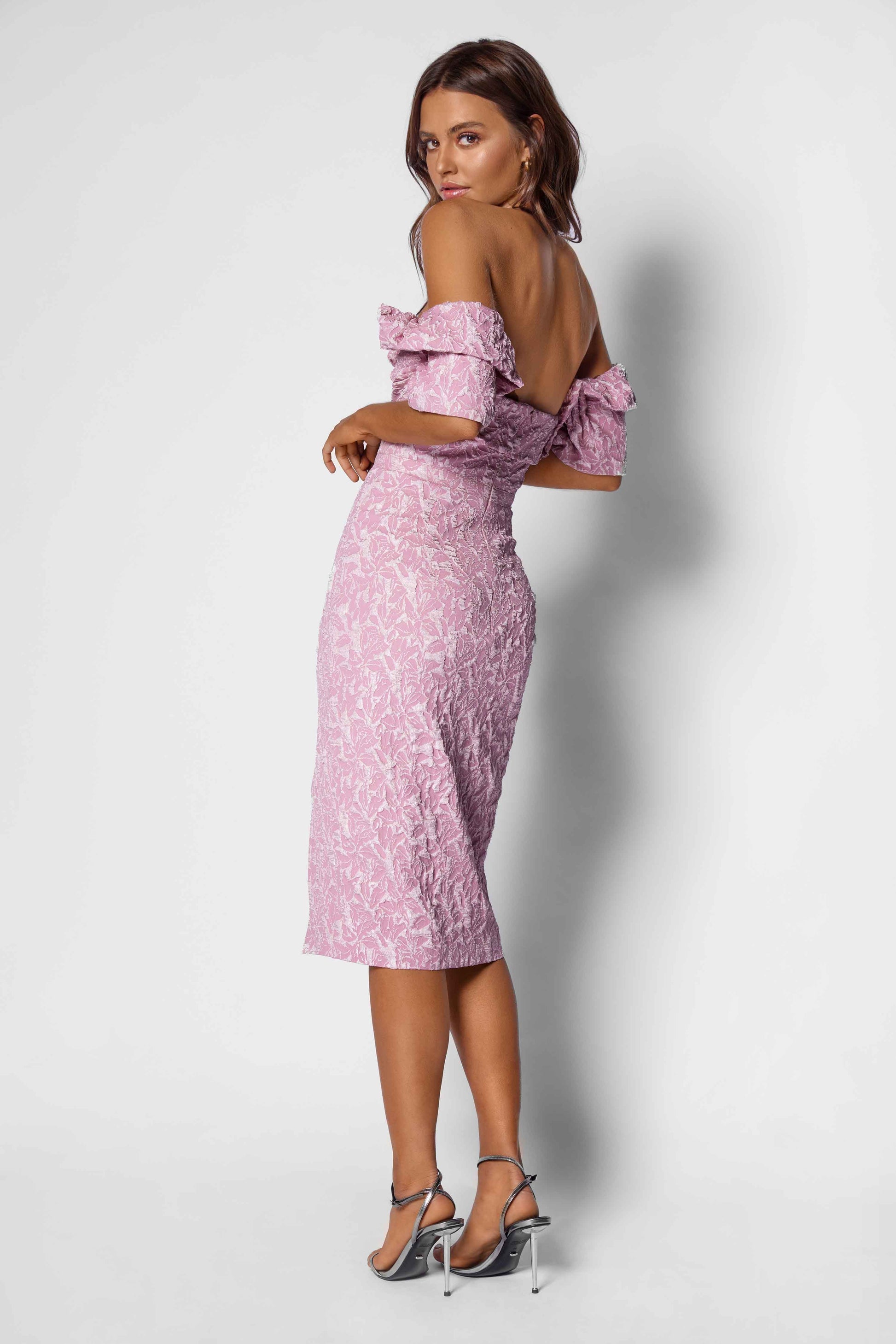 The Marlie Dress epitomises Elle Zeitoune's luxurious aesthetic with its off-the-shoulder midi cut and dramatic structured sleeves. Intricate floral embellishments add depth and sophistication to this captivating silhouette. A statement piece that exudes glamour and refined elegance for memorable occasions.