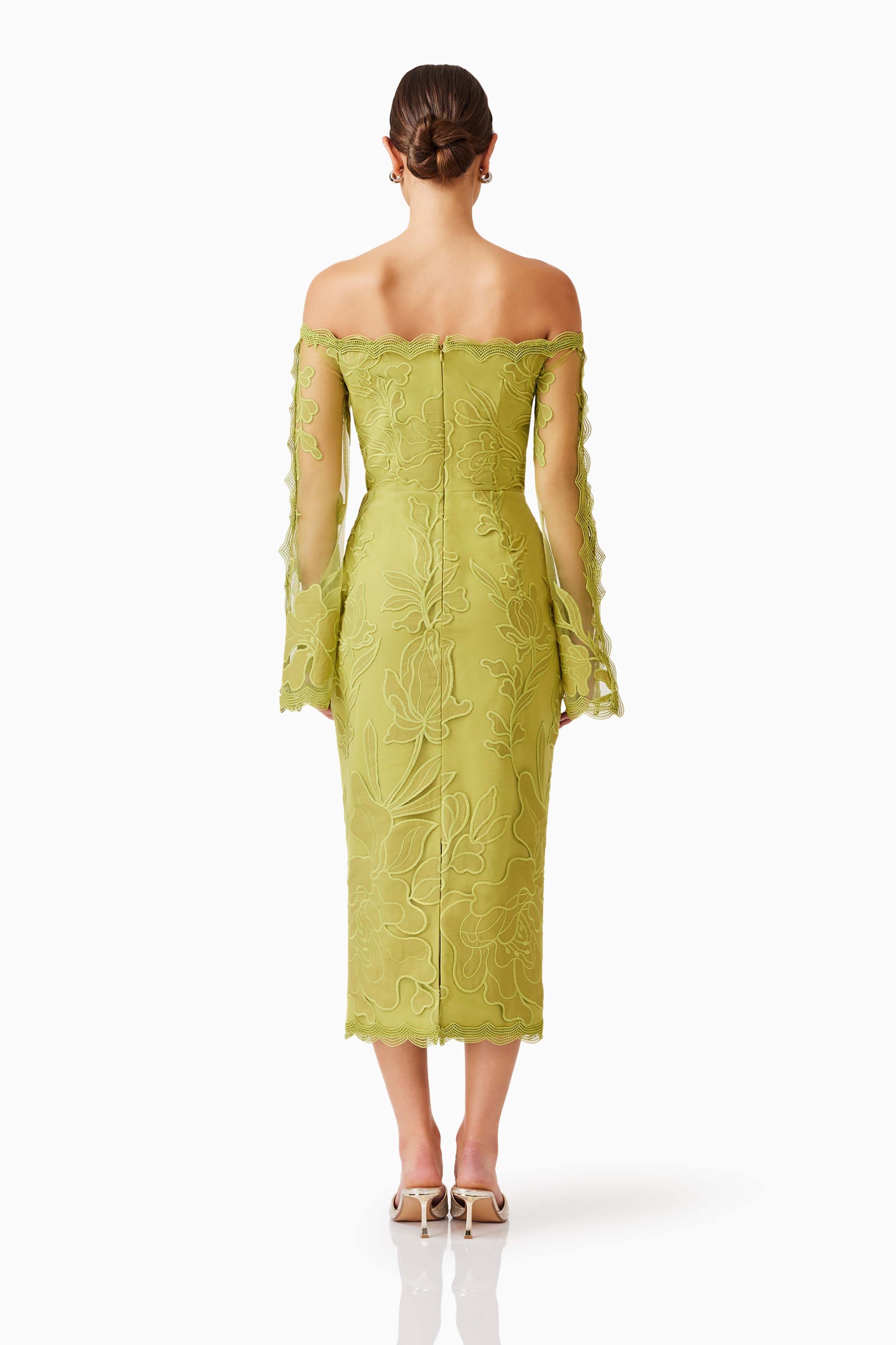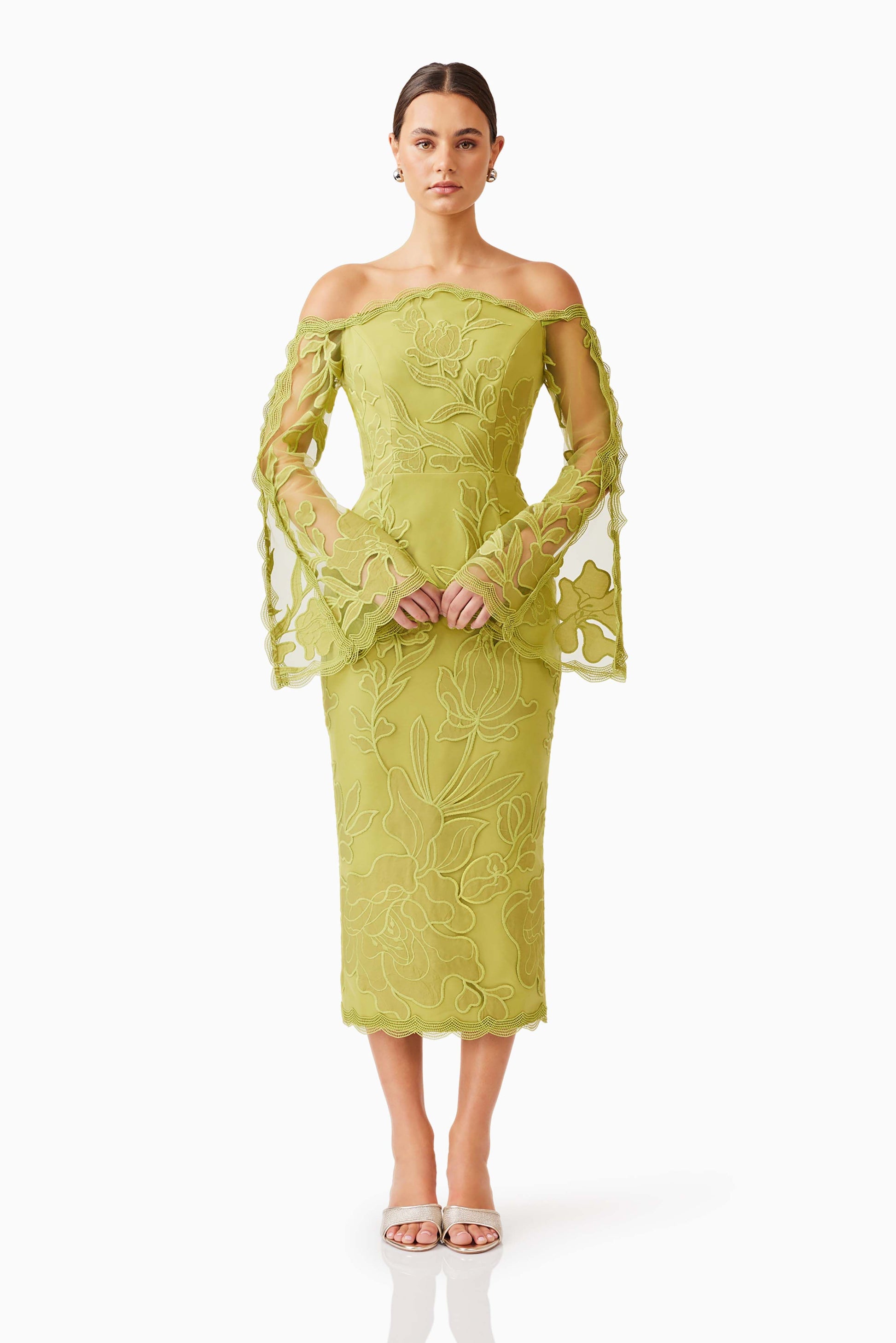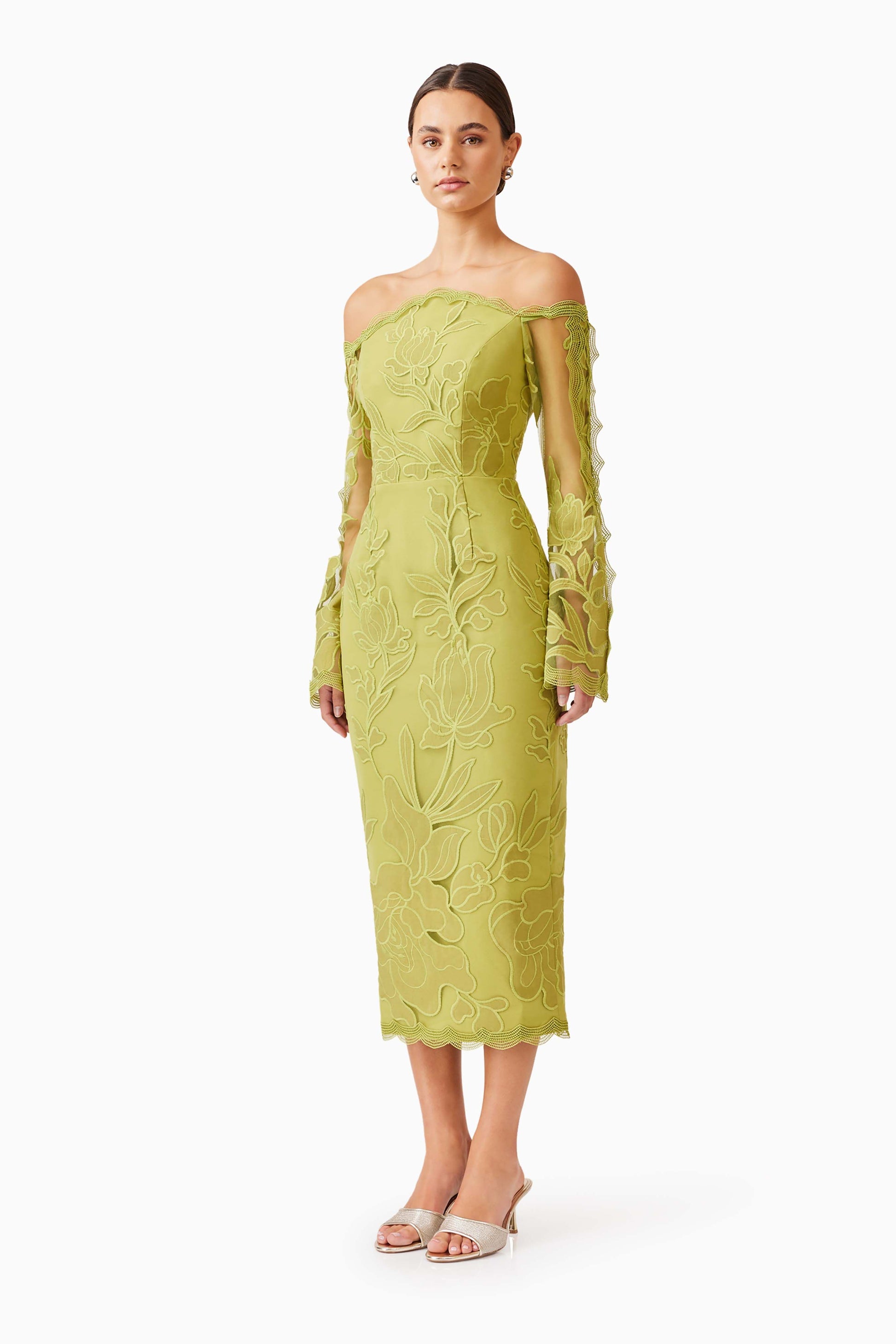 The Florian Long Sleeve Midi Dress in lemongrass showcases intricate embroidered lace with romantic belle sleeves trimmed in delicate detailing. The flattering neckline and tailored bodice create a polished silhouette, while the structured lace fabrication provides both elegance and texture. An invisible centre-back zipper ensures a seamless fit. Ideal for weddings, engagements, and formal occasions.